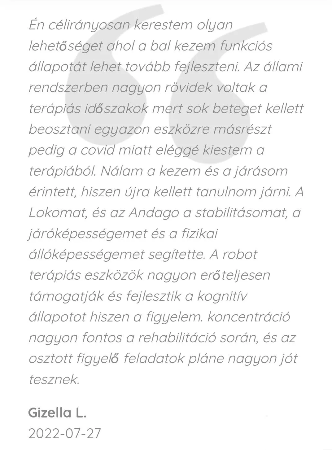 Az intenzív neurorehabilitáció döntő szerepet játszik az idegrendszer átszervezésének kedvező befolyásolásában, utat nyitva a betegek számára a lehető legtöbb funkció visszanyerésére. A hagyományos gyógytorna robottechnológiával kiegészítve a lehető legjobb eredményeket mutatja.